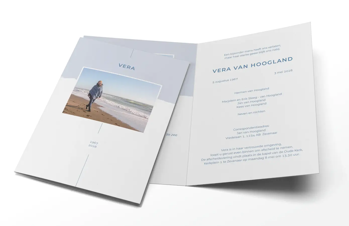 Dag en nacht bereikbaar bij een overlijden Uitvaartverzorging Van Tellingen UITVAARTVERZORGING VAN TELLINGENRouwkaarten met persoonlijke aandacht Bij Uitvaartverzorging Van Tellingen vindt u rouwkaarten die met zorg en aandacht zijn ontworpen. U kunt kiezen uit traditionele ontwerpen, moderne kaarten of een kaart met een persoonlijke foto. De tekst kunt u zelf samenstellen of kiezen uit onze voorbeeldteksten. Compleet aanbod rouwkaarten Bij Uitvaartverzorging Van Tellingen kunt u kiezen uit een breed assortiment rouwkaarten in verschillende stijlen: van klassiek en ingetogen tot modern en persoonlijk. Kaarten kunnen eenvoudig worden aangepast, bijvoorbeeld met een eigen foto, tekst of een andere papiersoort. Zo ontstaat een rouwkaart die qua stijl en uitstraling past bij het afscheid. Ons drukwerk verzorgen wij volledig in eigen beheer. Hierdoor kunnen wij zorgvuldig toezien op de kwaliteit en afwerking van de kaarten. Ook de enveloppen en verzending van de rouwpost worden door ons geregeld. Wij houden rekening met de verzendtijden, zodat de kaarten tijdig bij familie en vrienden worden bezorgd. Bekijk collectie Voorbespreking Het is verstandig om van te voren over een uitvaart na te denken. Zo komt u straks niet voor onverwachte beslissingen te staan. Vraag nu een gratis en vrijblijvend voorgesprek aan. Aanvragen Mijn laatste wensenboekje Leg uw wensen rondom uw uitvaart zelfstandig vast in een ‘mijn wensenboekje’. Deze kunt u gratis en vrijblijvend opvragen. Aanvragen UITVAARTVERZORGING VAN TELLINGEN Alles rondom de uitvaart Uitvaartverzorging Van Tellingen verzorgt alles rondom de uitvaart in eigen beheer. Wij staan 24/7 klaar om u volledig te ontzorgen, van uitvaartcentra en uitvaartkisten tot bloemen, rouwvervoer, rouwdrukwerk en kistdragers. Wij bieden persoonlijke begeleiding, afgestemd op uw wensen en behoeften. Uitvaartcentra Uitvaartkisten Rouwvervoer Rouwkaarten Bloemen
